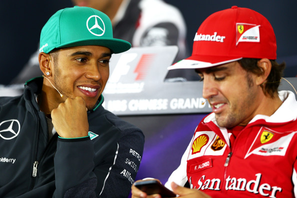 Race winner Lewis Hamilton and Fernando Alonso. Photo: Clive Mason/Getty Images